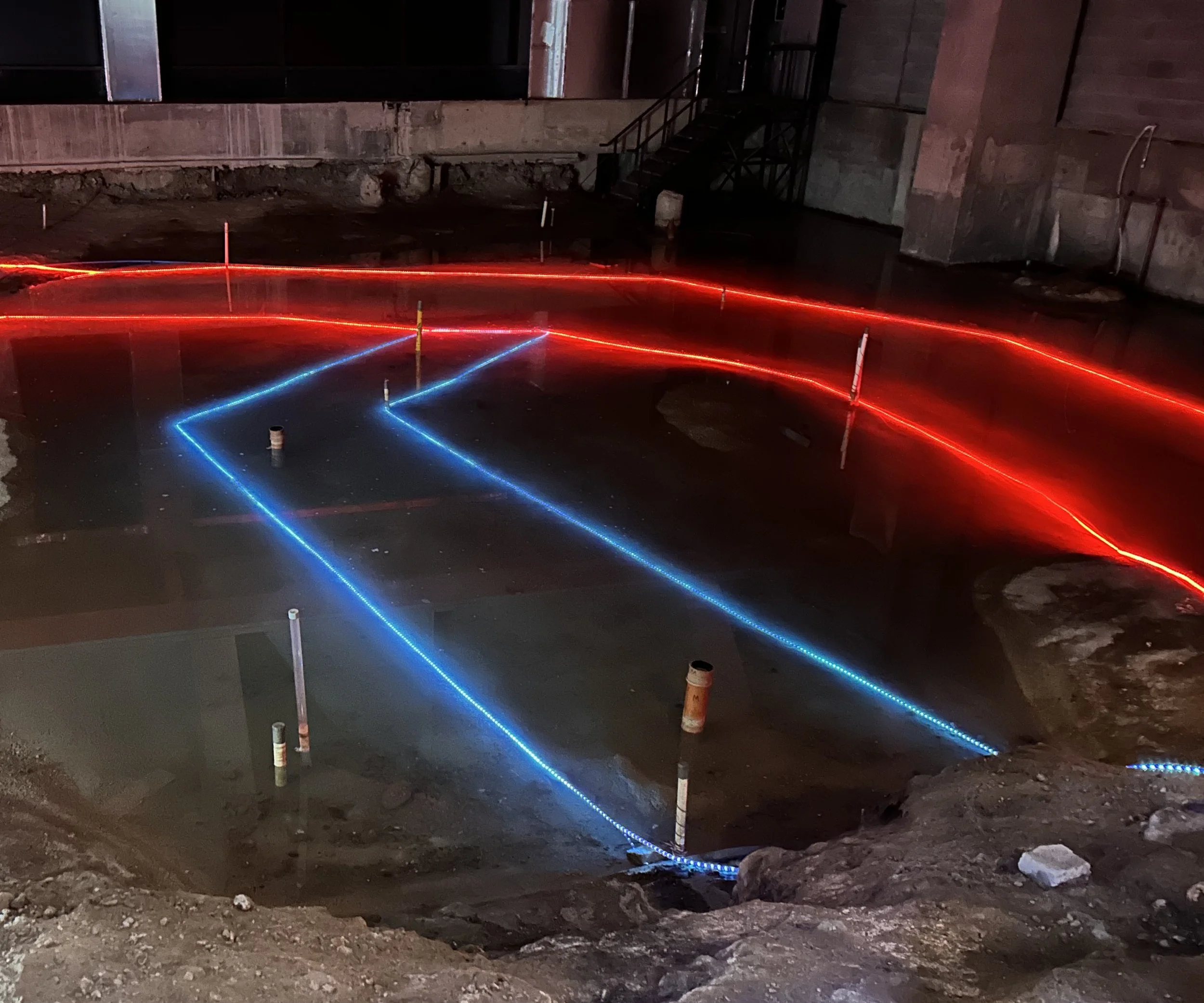 Two rows of blue rope lights show the original position of the front of the stage in 1587, and then when it was pushed back as the playhouse was expanded to the north in 1592/3.