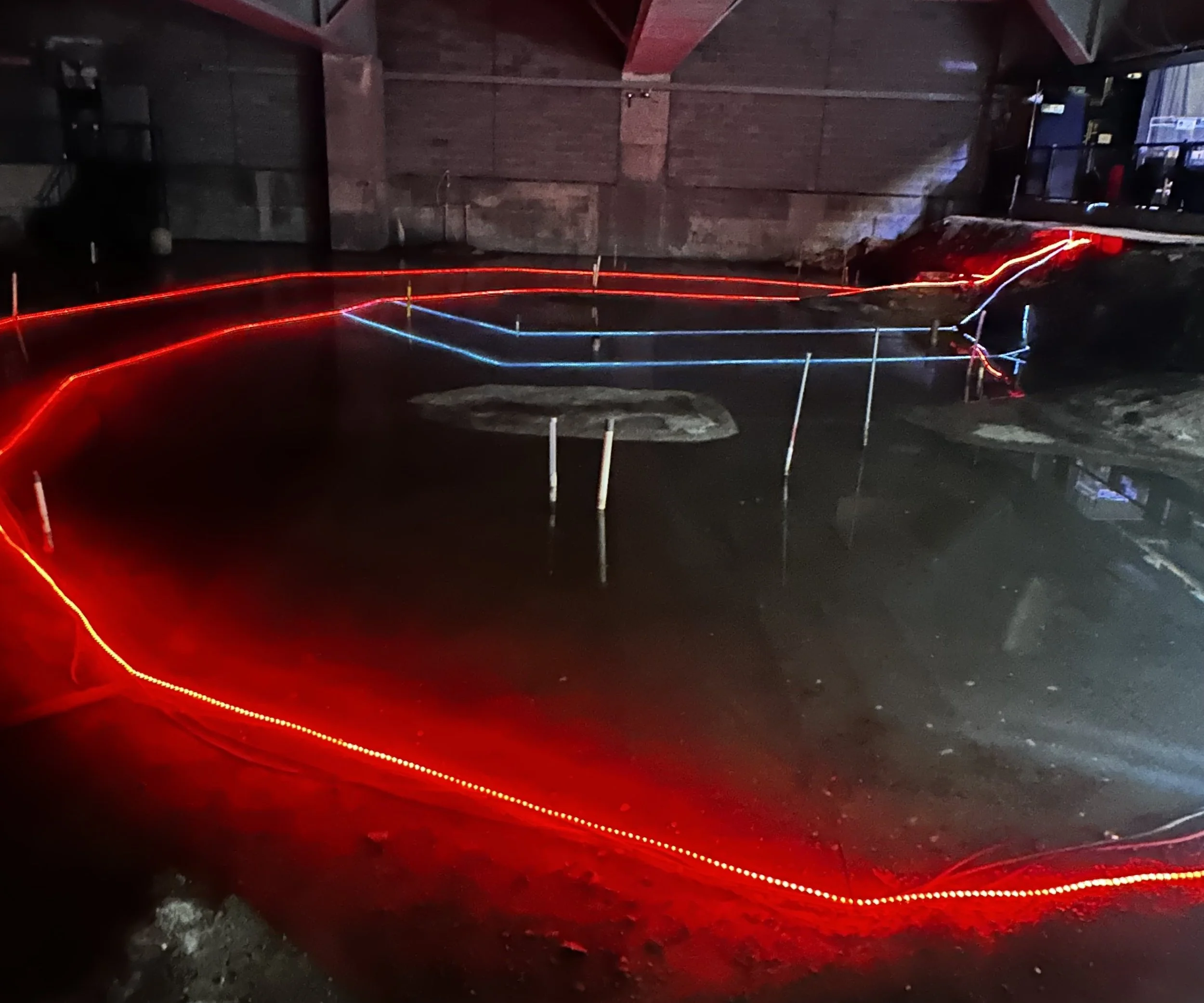 A carefully designed scheme of Buckland sand containing a leaky pipe seals the deposits, under a layer of plastic sheeting and weak mix concrete into which water is gradually fed.